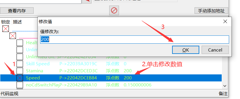 5.勾选功能并修改数值,例如,我们修改人物的速度“Speed”,把速度改到200