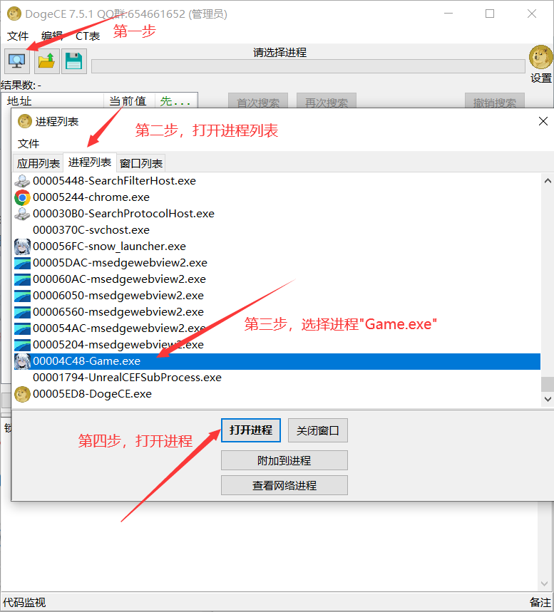 2.打开游戏,然后使用CE的进程列表中选择白尘的进程“Game.exe”3.将CT表拖动到CE里面