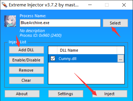 打开游戏,选择游戏进程名“BlueArchive.exe”,选择dll点击“inject”注入即可